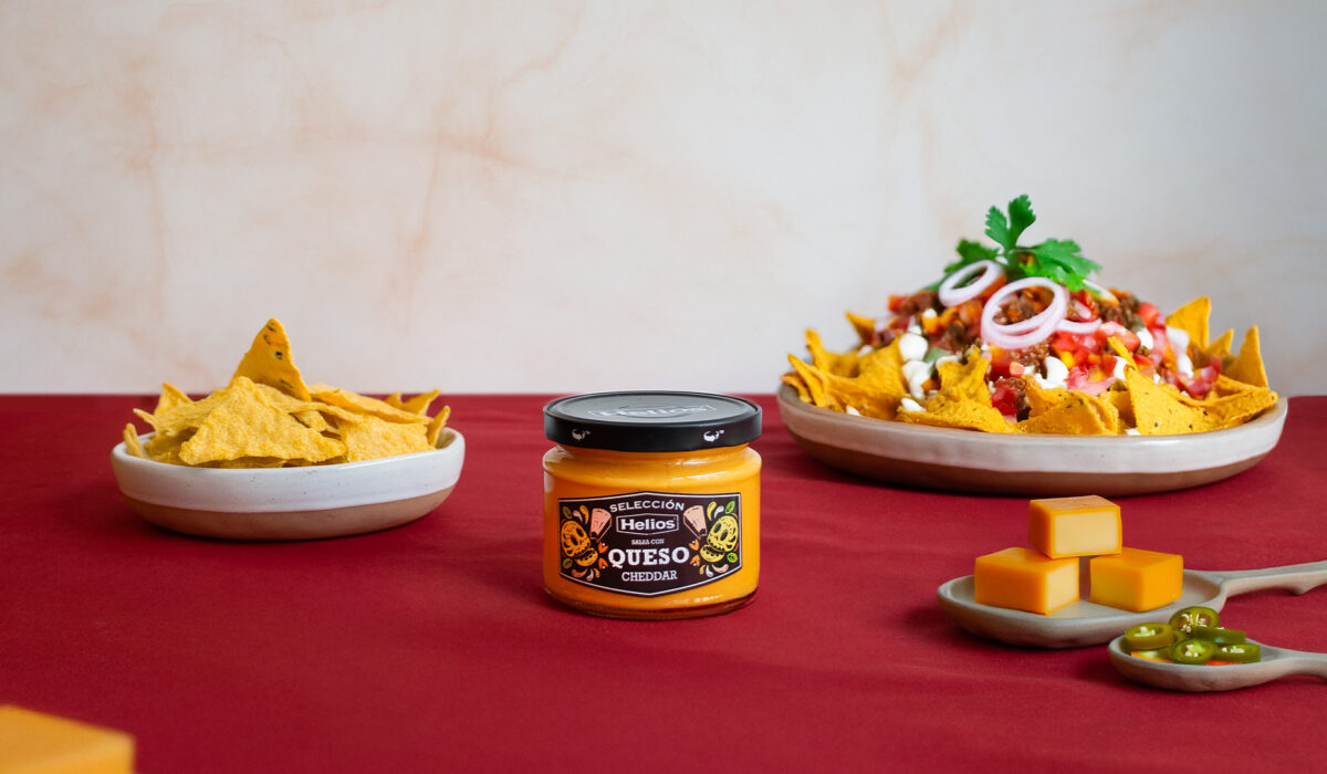 La salsa con queso cheddar Helios Selección es una invitada de lujo para tus mejores momentos